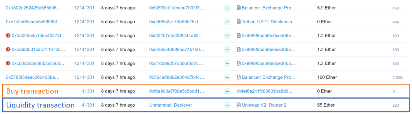 On March 30th the $MARSH token added significant initial liquidity to Uniswap, and the transaction lingered in the mempool for 4 minutes. That time was long enough for a searcher to find it and combine their own buy transaction.