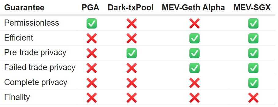 Robert Miller presented the design for a future flashbots core infrastructure with complete cryptographic guarantee for privacy. MEV-sgx is a solution aiming to provide searchers a way to send their transaction bundles to miners directly without the need for a relay and to keep those bundles private until mined. It is the next step in achieving our design goals listed above, and we will be formally releasing our spec in the coming weeks.