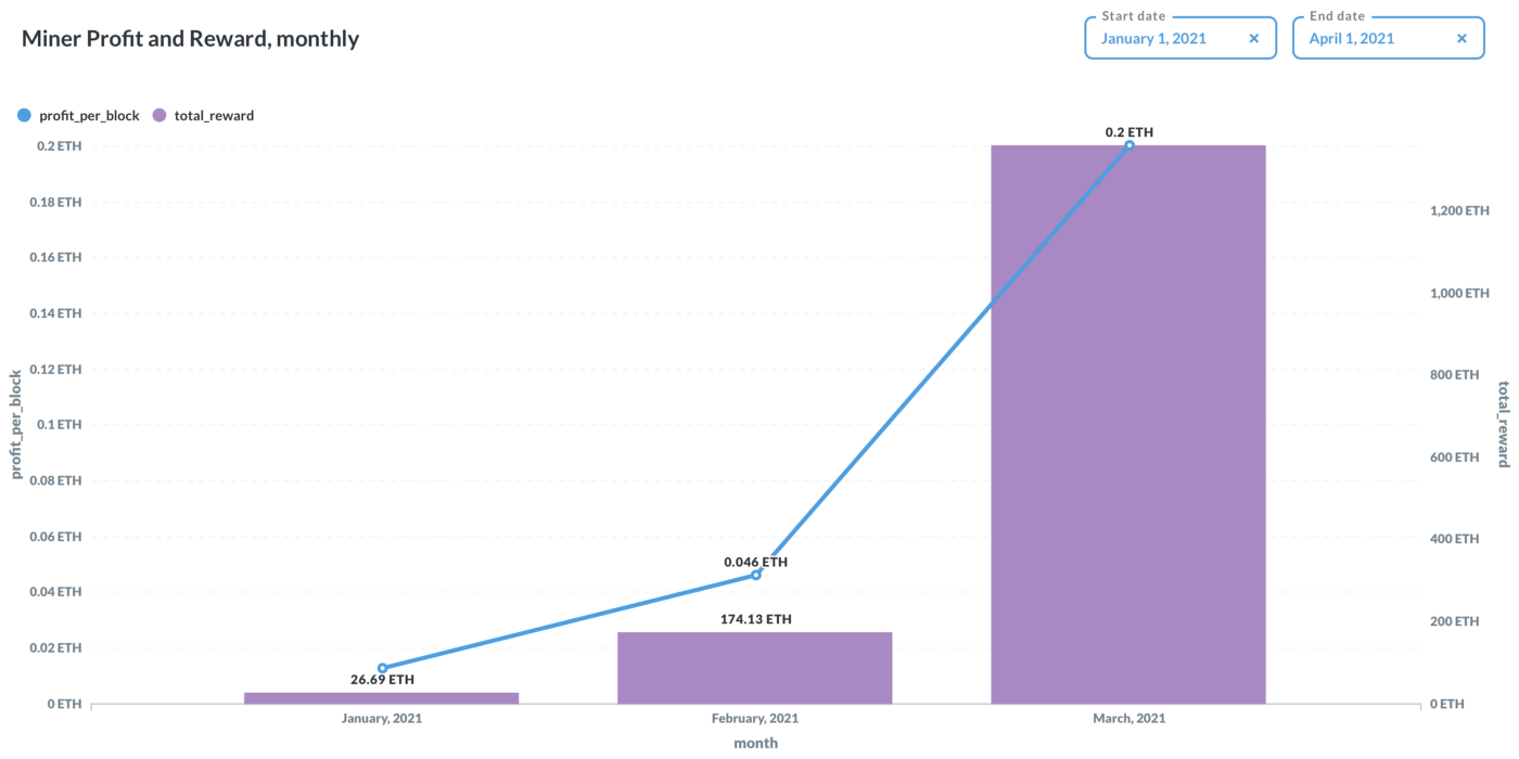 Source: Flashbots, Etherscan. Miner profit is calculated as miner revenue net of opportunity cost (tail gas of the block), reward is the total miner tips per flashbots bundle. Date range: Jan 1 to Apr 1.
